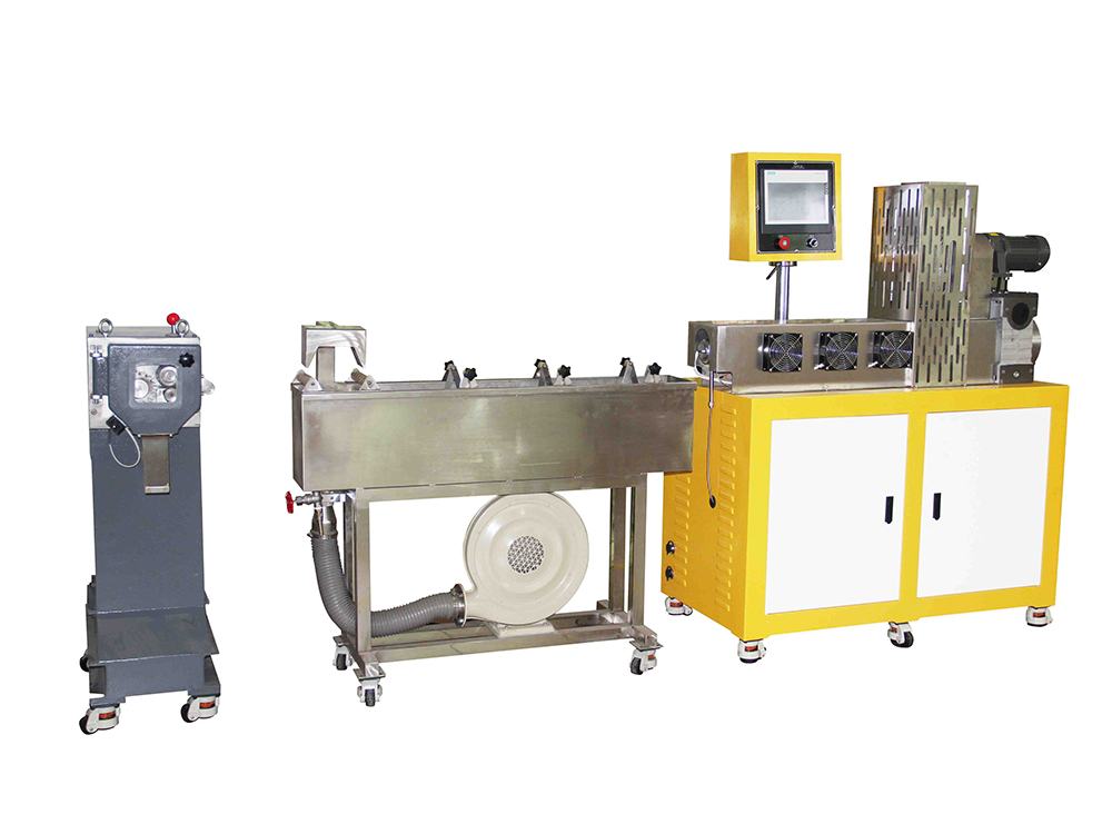 其工作原理為:物流從料斗里放入經(jīng)過擠出裝置的塑化和擠出變?yōu)榱餮訝顟B(tài),再從主機經(jīng)模頭出來,擠出機組的用途不同其選配用的輔助設備也不盡相同。