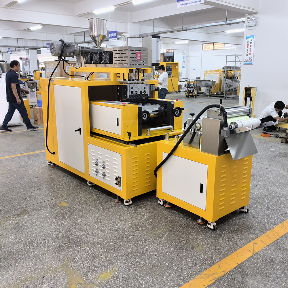流延擠出機通過將塑料顆粒加熱熔融后擠出,形成薄膜,并通過冷卻輥定型,是塑料薄膜生產的重要設備。 工作原理 流延擠出機的工作原理主要包括以下幾個步驟: 原料準備:塑料顆粒或粉料通過加料裝置送入擠出機。原料在擠出機內被加熱、熔融和塑化。 擠出過程:熔融的塑料通過螺桿的旋轉被推送至模頭,經過模頭的縫隙流出,形成薄膜狀的熔體。 冷卻定型:熔體離開模頭后,迅速接觸到冷卻輥,經過冷卻后定型。為了防止熔體在冷卻過程中出現收縮或卷邊現象,流延輥兩側通常會設置氣刀或電子鎖邊裝置,利用壓縮空氣將薄膜緊貼在冷卻輥上。 后處理:冷卻后的薄膜經過多級牽引、測厚儀、電暈處理等工序,最終卷繞成品。整個過程需要精確控制氣刀位置、風速和真空度,以確保薄膜的厚度均勻和表面質量良好
