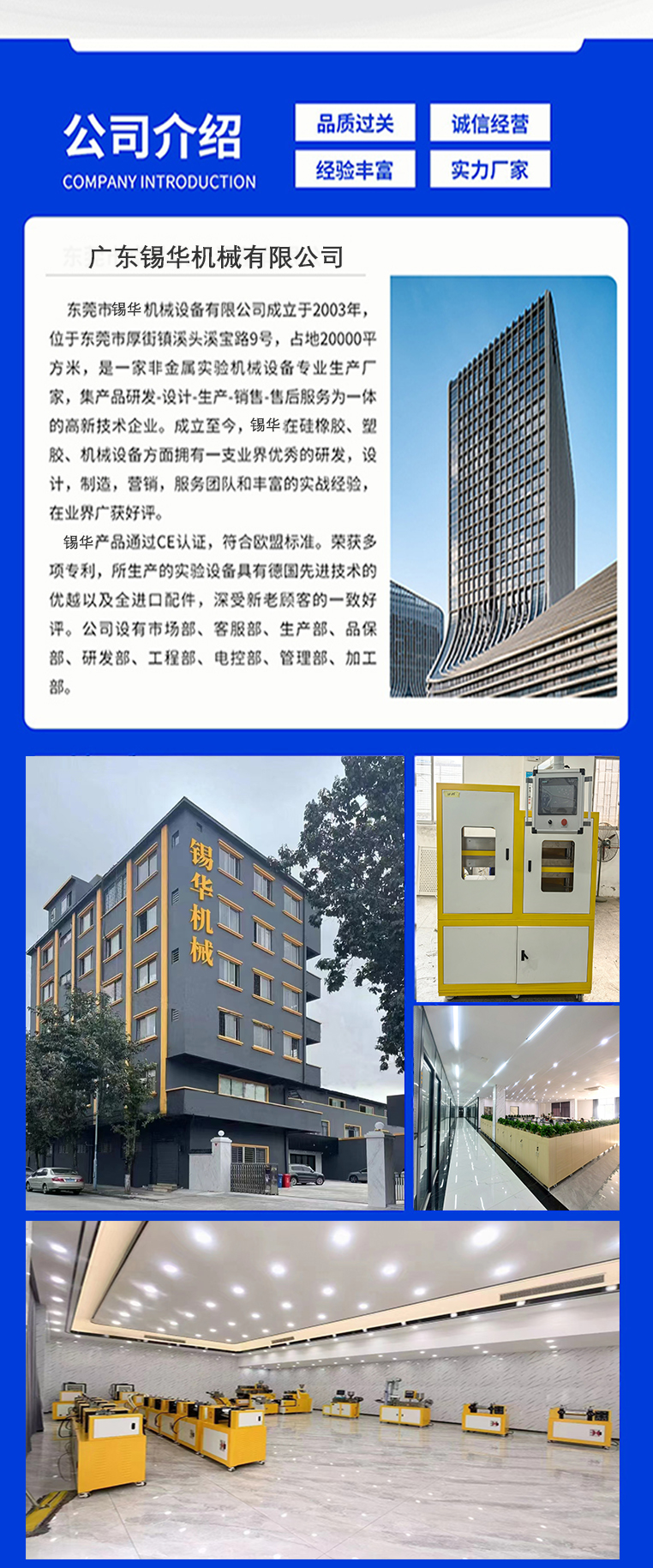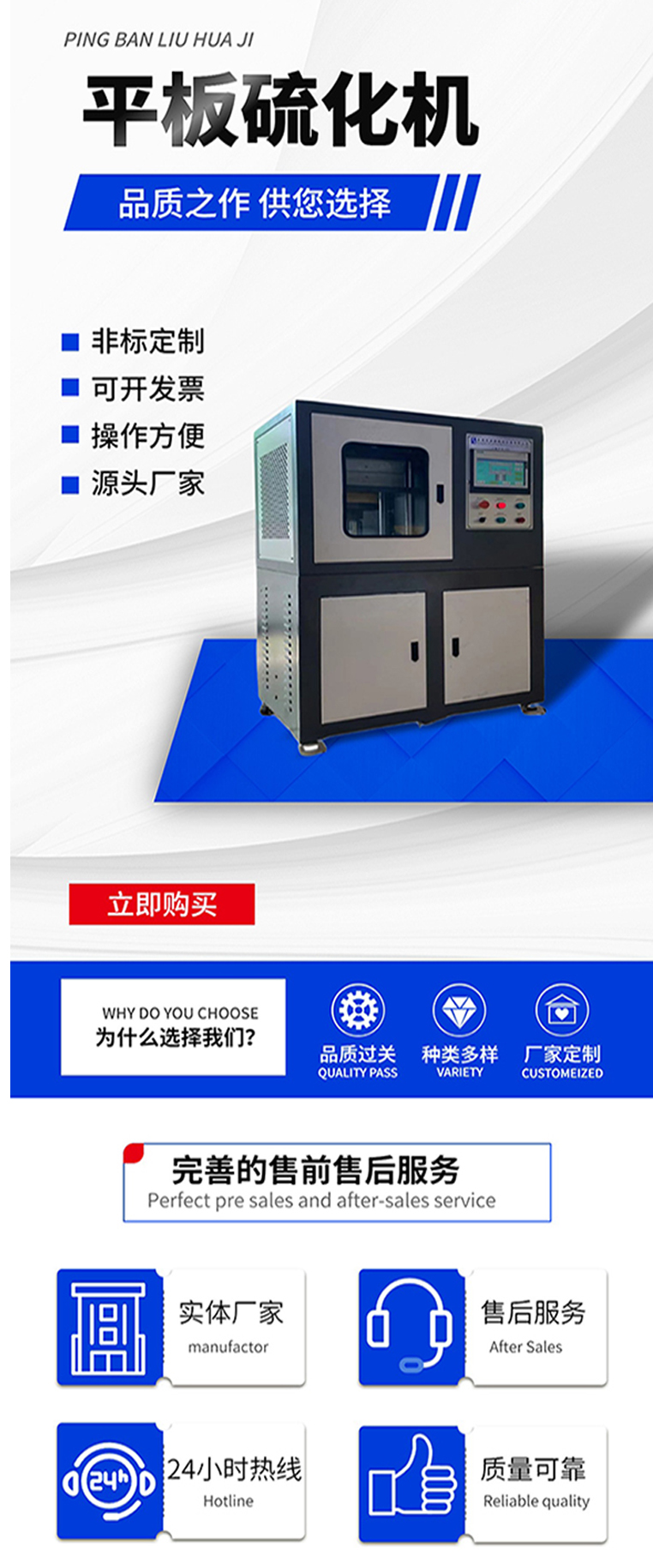 其主要功能是將原料放于鑄模內,夾于本機電熱平板間,加以壓力及溫度,以供試驗,做為工廠大量生產配料之依據.